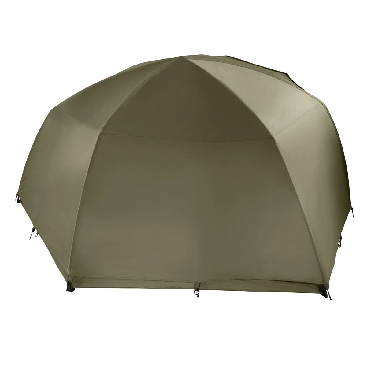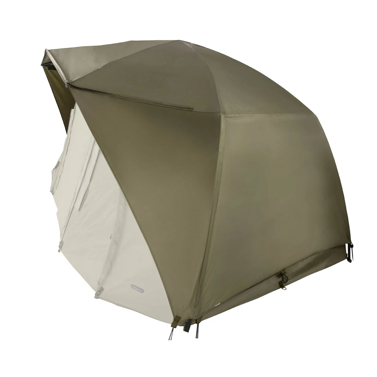 De verlengde zijkanten en achterkant bieden bovendien volledige dekking van de dubbele huid van boven tot onder. De Tempest Brolly 100 Skull Cap Wrap kan eenvoudig in enkele seconden worden gemonteerd via een spigot-systeem op de drie voorste palen en wordt vervolgens eenvoudig rond de bivvy vastgemaakt met de ventilatieopeningen aan de achterkant. Op deze manier kun je als het warmer wordt gemakkelijk weer lucht door je schuilplaats kunt laten stromen. Zo zorgt de Skull Cap Wrap ervoor dat het op warme dagen een stuk koeler blijft in je bivvy.